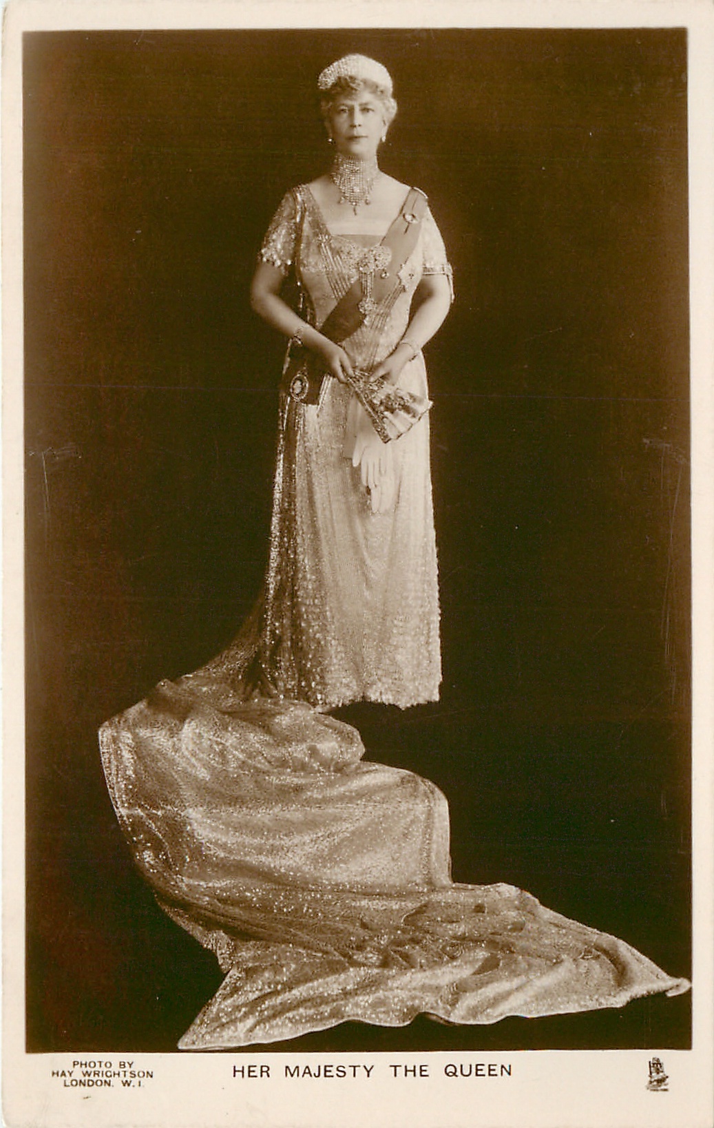 HER MAJESTY THE QUEEN standing with flowing train arranged in front