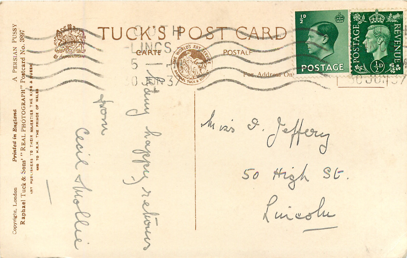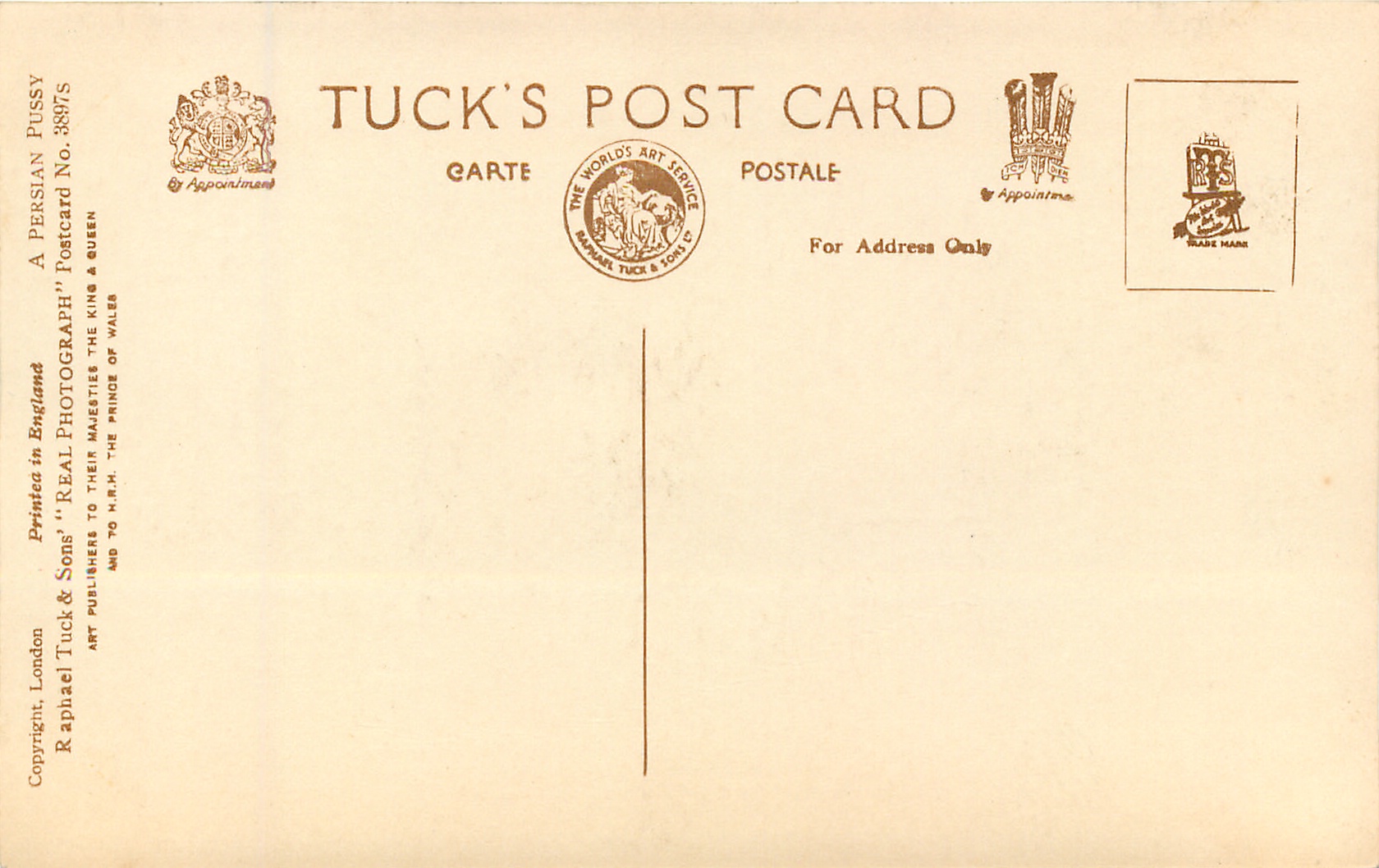 REAL PHOTOGRAPH, PRINTED IN ENGLAND, COPYRIGHT LONDON, comes also with A PERSIAN PUSSY in the set title position, packet number 608, comes with card letters, 2 backs