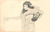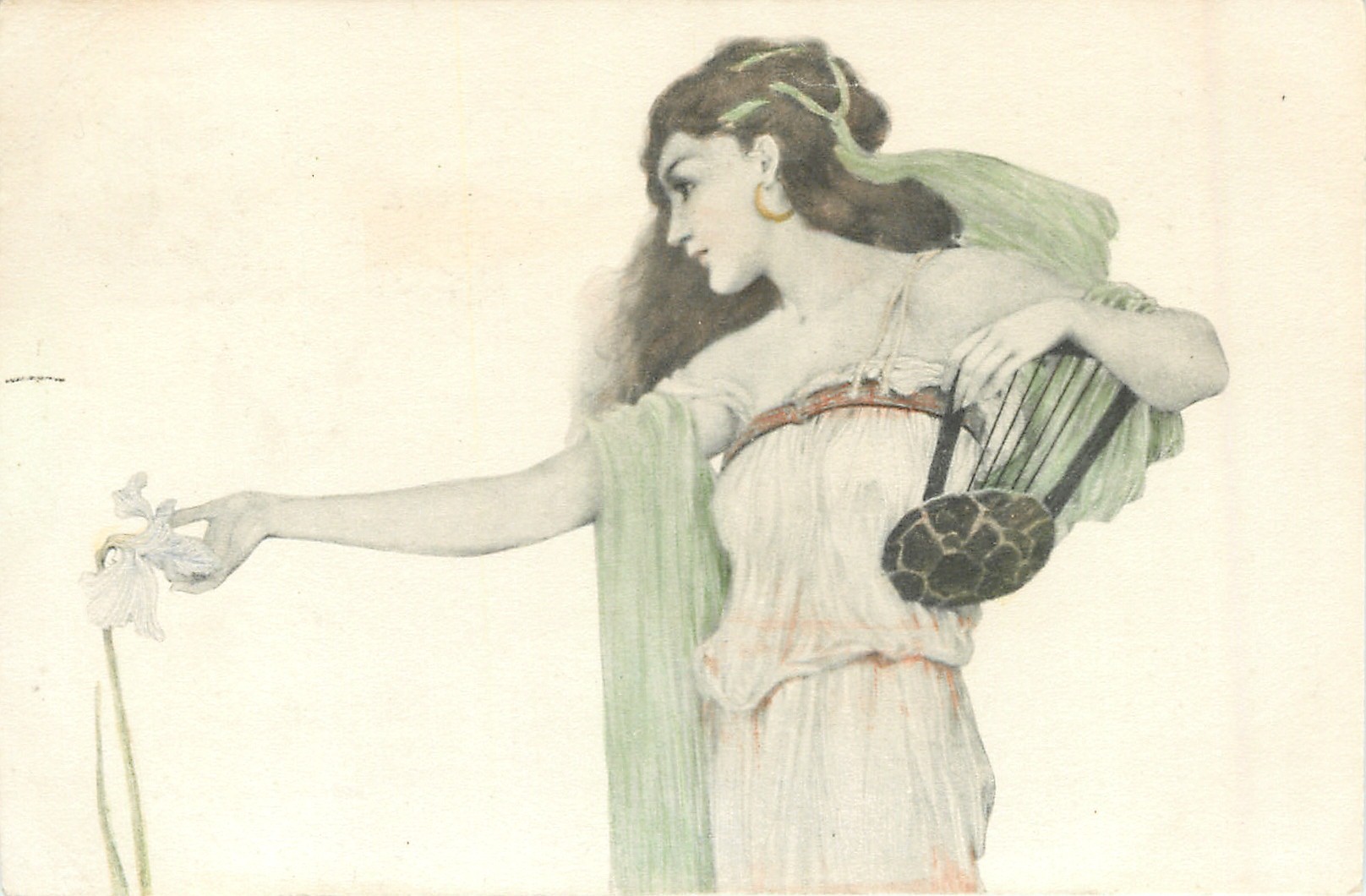 girl with musical instrument under her left arm touches an iris with her extended right hand