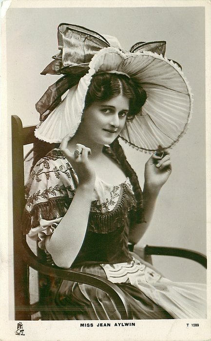 MISS JEAN AYLWIN sits in chair touching hat with very wide brim with both hands, faces mostly right, glances front