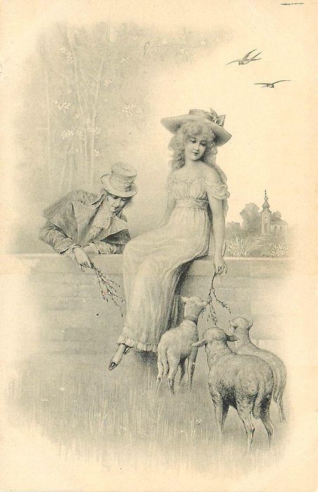 girl sitting on wall feeding small branch to three lambs, man leaning over wall