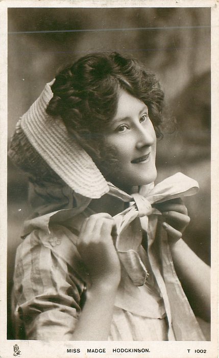 MISS MADGE HODGKINSON head & shoulders, adjusting bow under chin with both hands