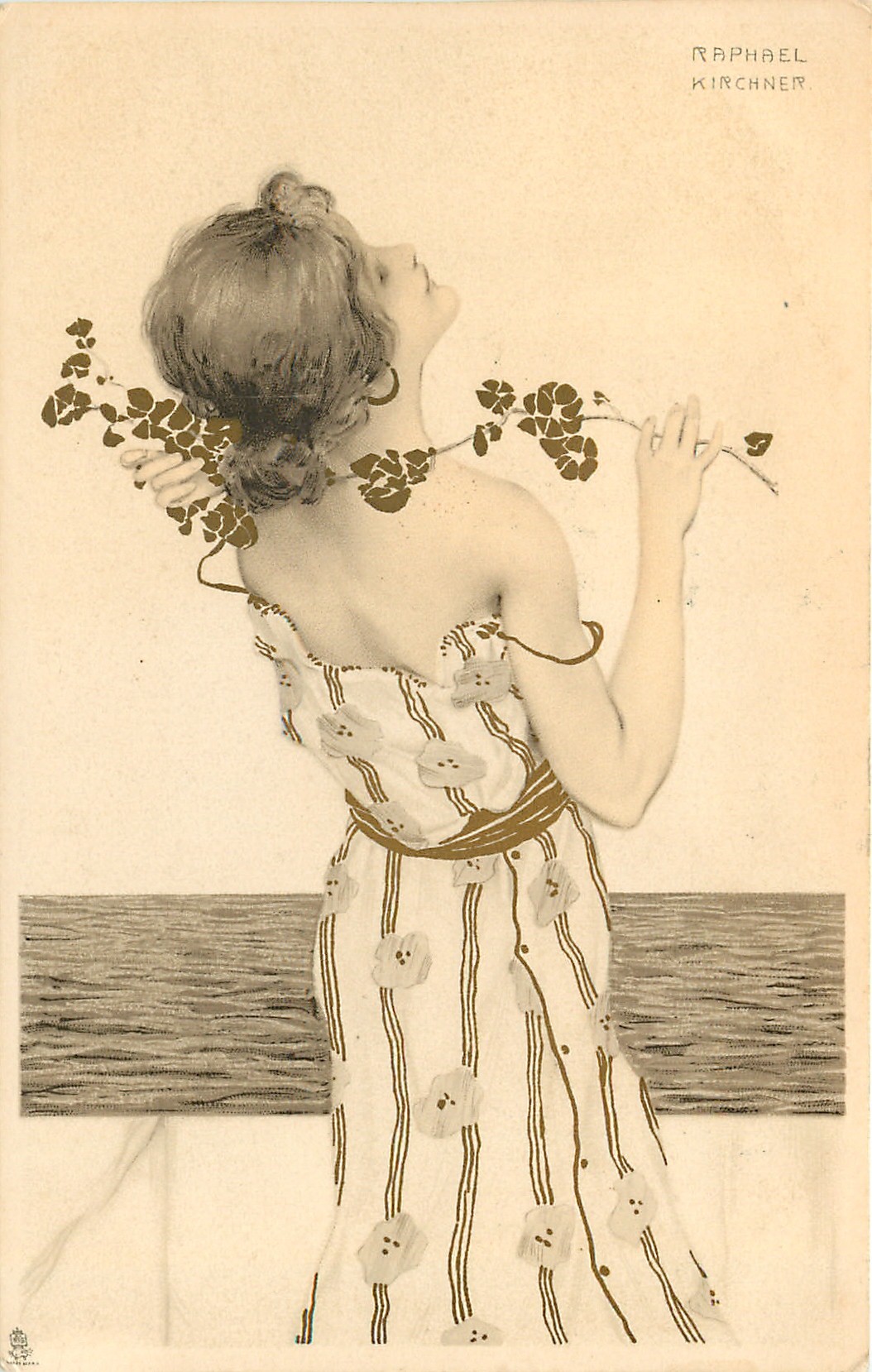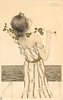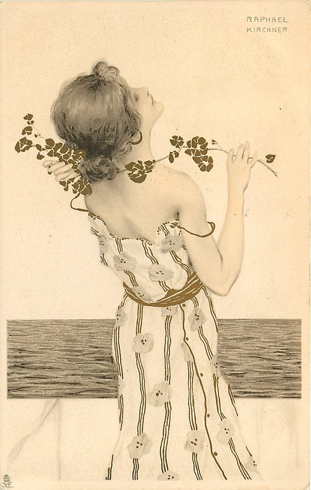 girl looks up and out to sea, spray of flowers over her right shoulder