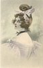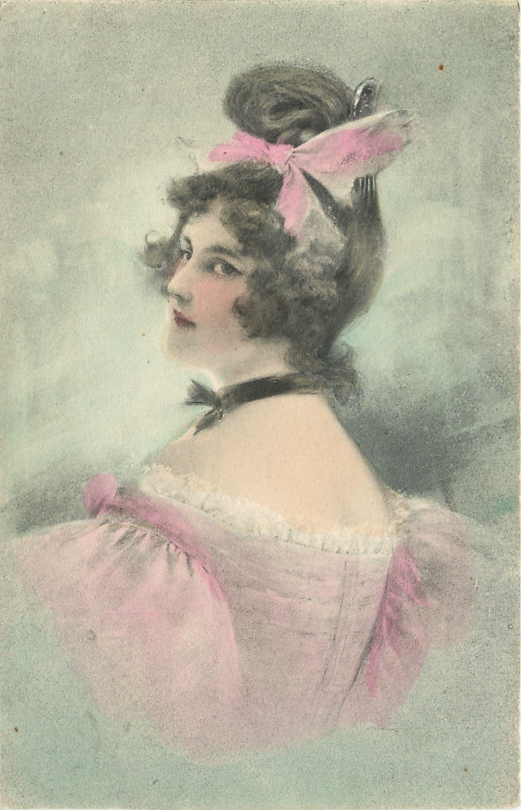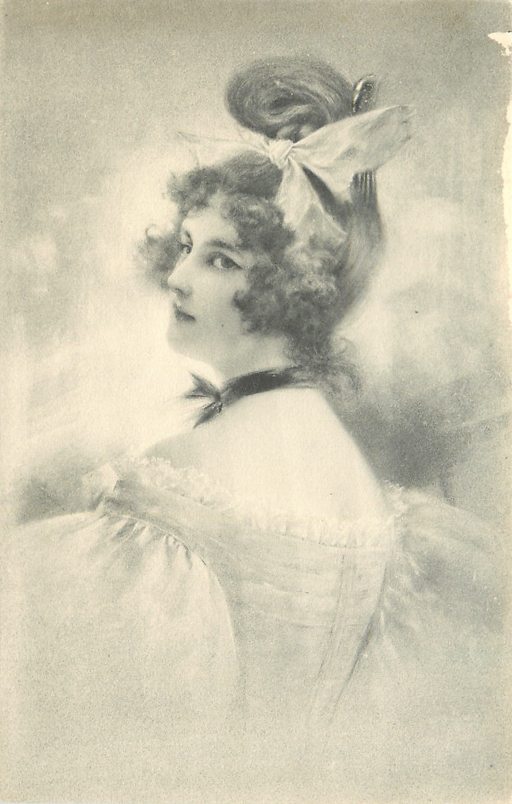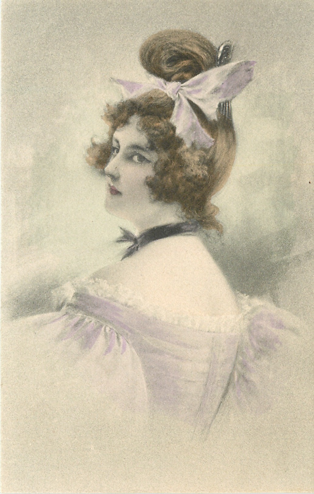 head and shoulders study of pretty woman, has ribbon around neck, shoulders face away to left, bow in hair