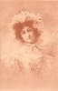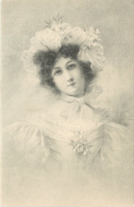 head and shoulders study of pretty woman, wearing head-dress of lace & flowers secured with large bow at neck, looks ahead