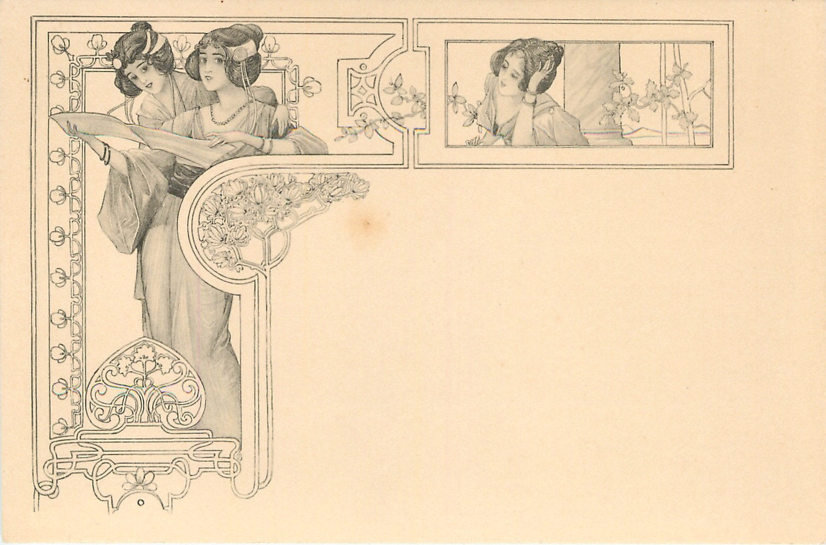 ornamental surrounds, two girls stand at left reading, another in small inset upper right