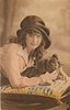 pretty girl in floppy bonnet leans over pekingese dog on cushion on a table, both face right, look front, her right hand on dogs neck