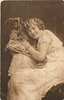 young lady sits looking forward facing left, left hand supports pekingese dog sitting up by her face
