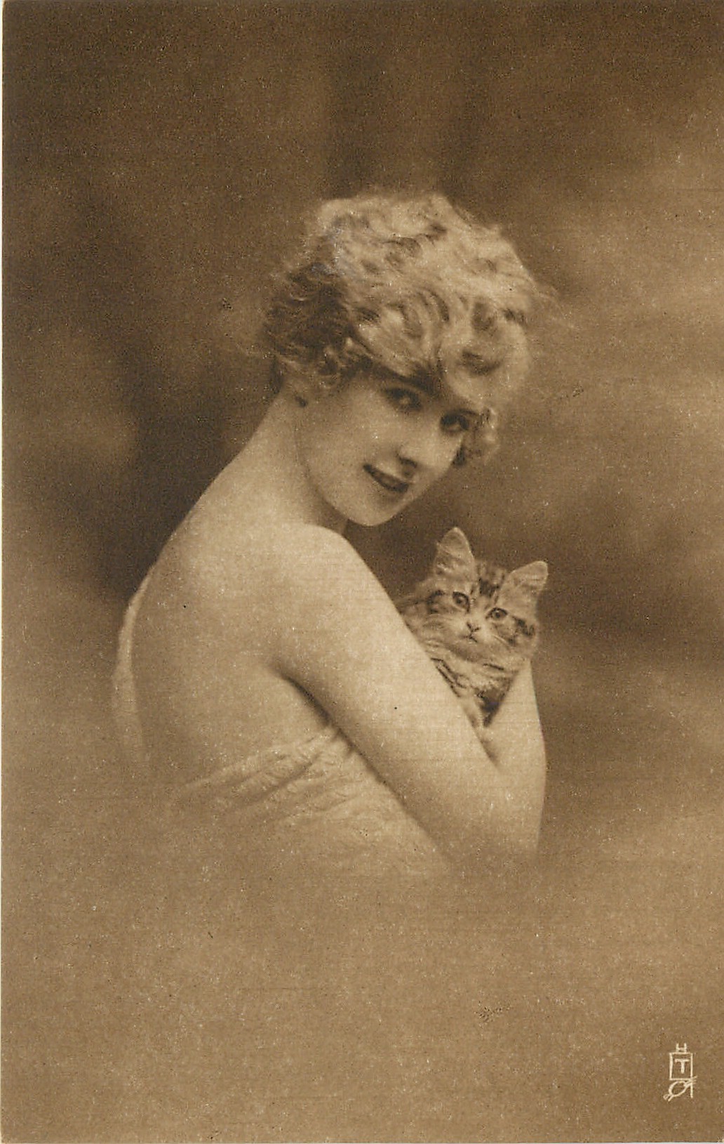 girl faces right looking front holds kitten in right arm, left hand not visible