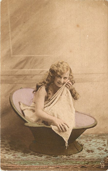 girl facing & looking forward, covered by towel in portable bathtub, her left hand holds towel to right cheek