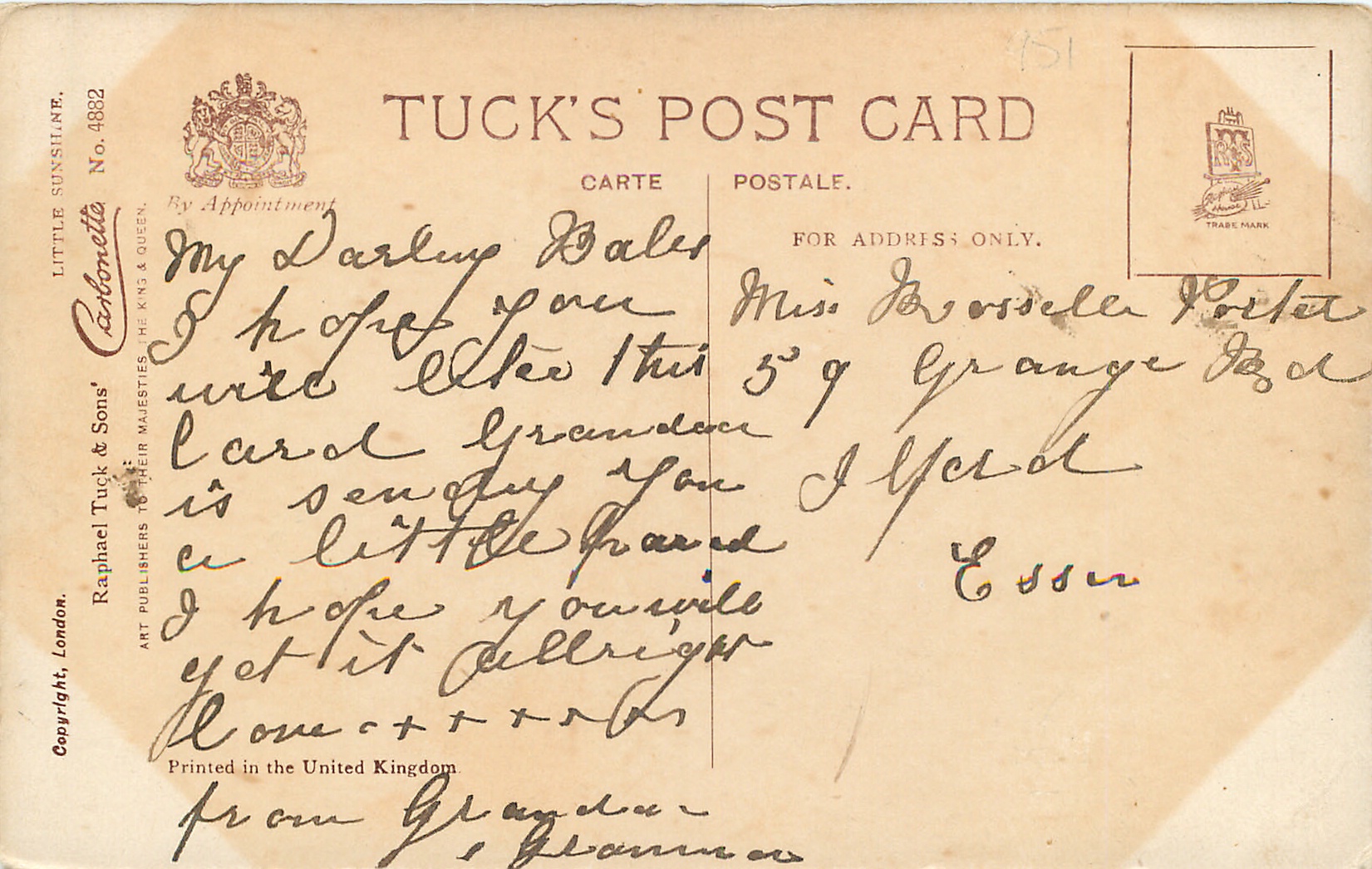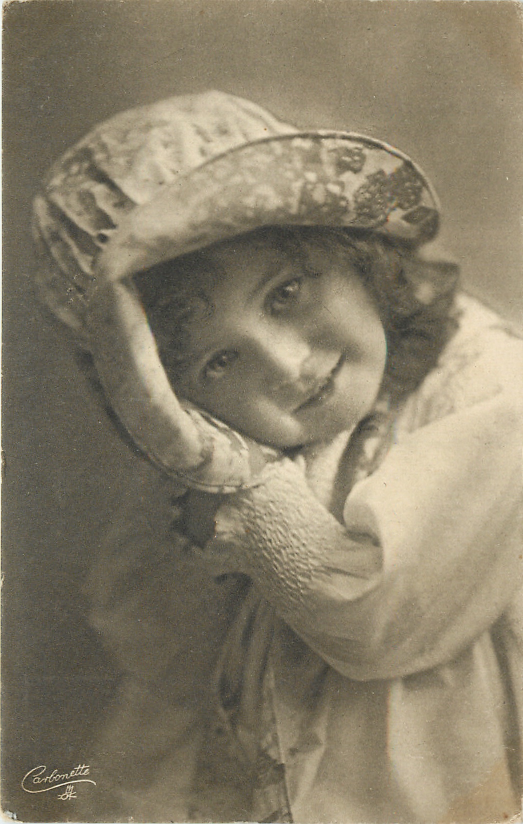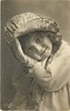head & shoulders study of young curly haired girl with embroidered dress & hat, faces left, head leaning on hands