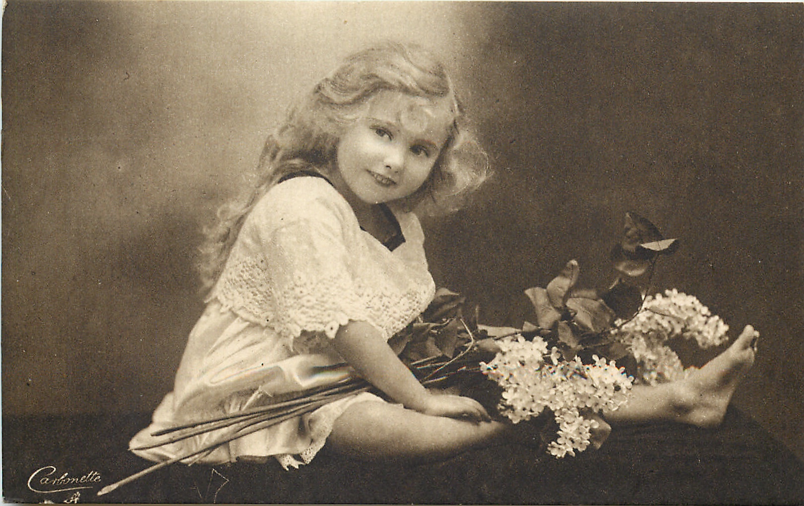 smiling girl in dress with lace top sits facing right, lilacs on legs, looks front