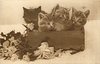four kittens in box, flowers & leaves in front