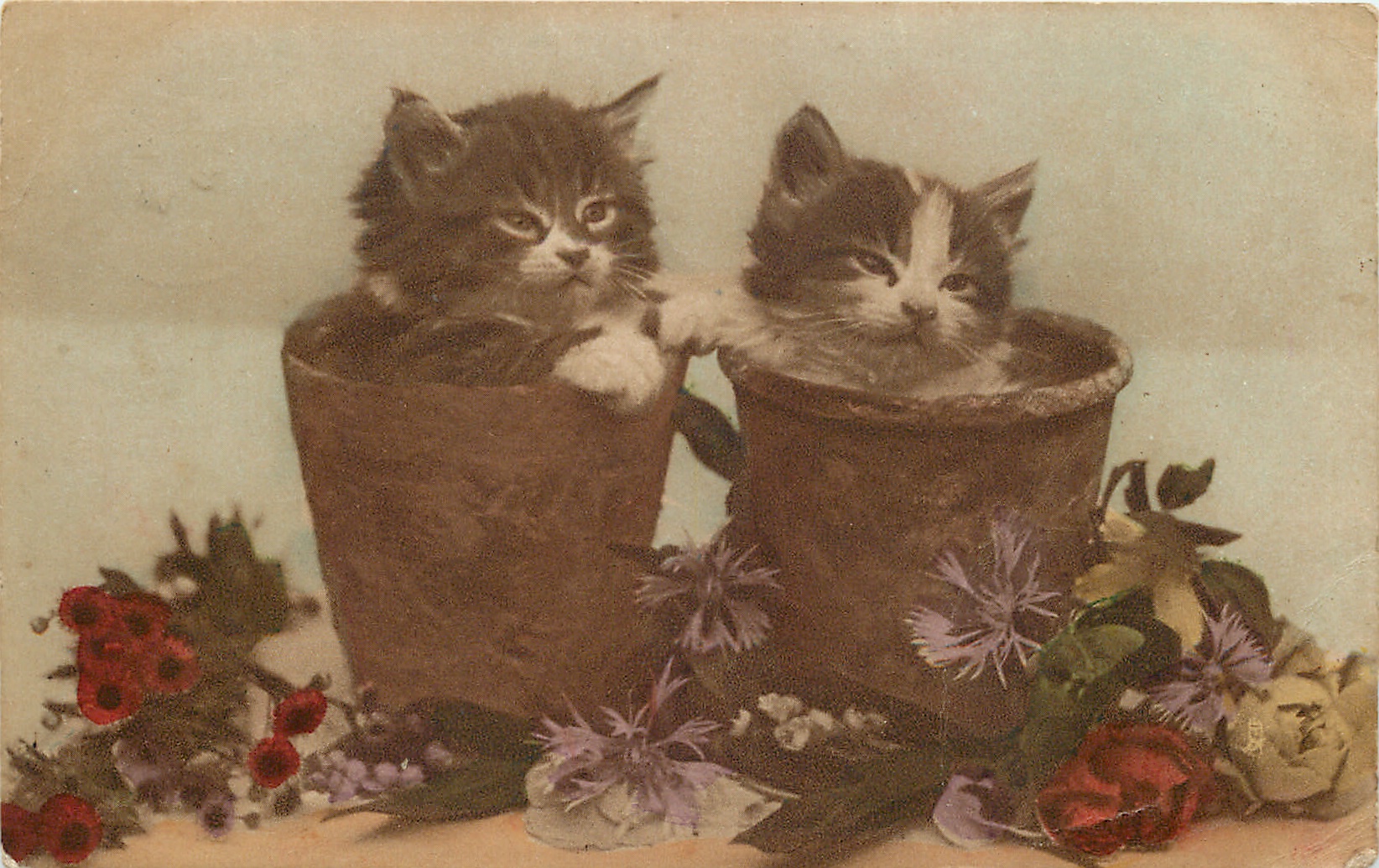 two kittens sitting up in flower pots, flowers & leaves in front