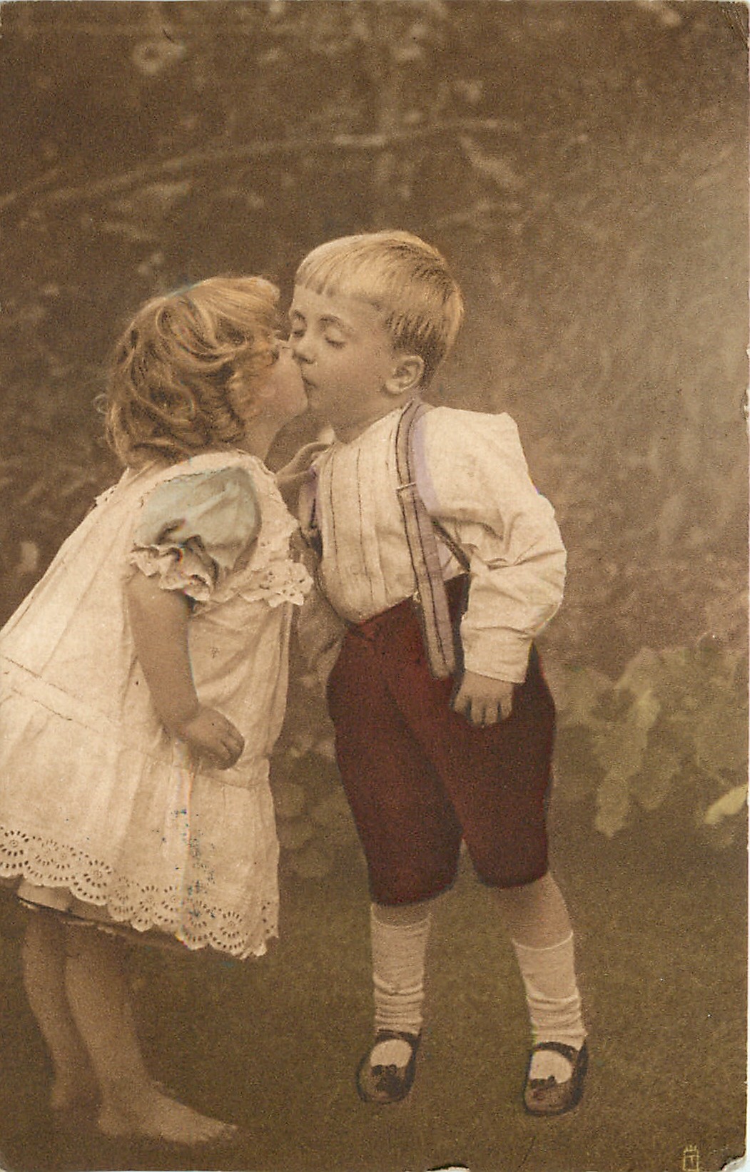 young children, standing, girl on left bends forward slightly to kiss boy on right