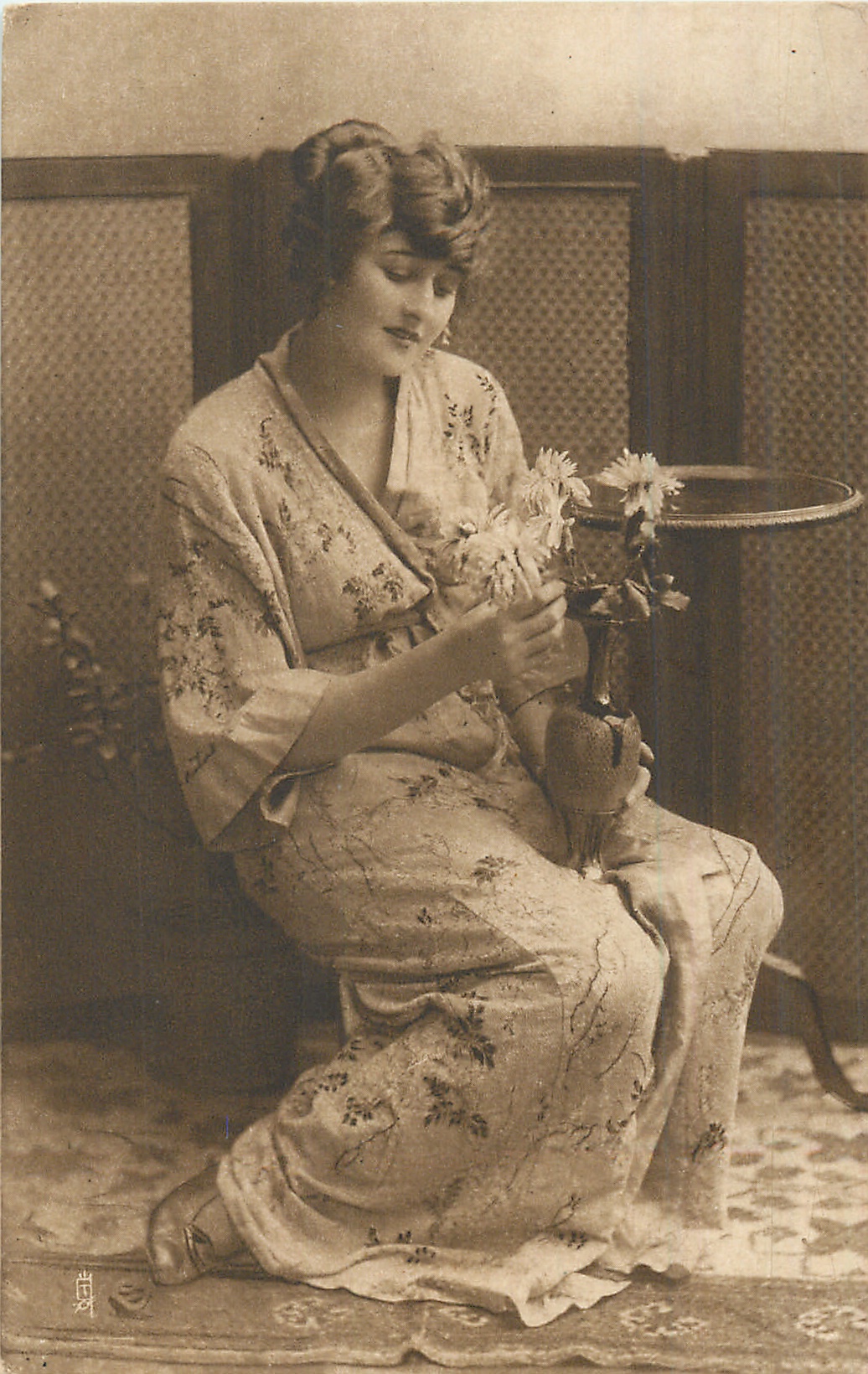 lady in Japanese dress sits on low stool, looking front, vase of flowers on her lap