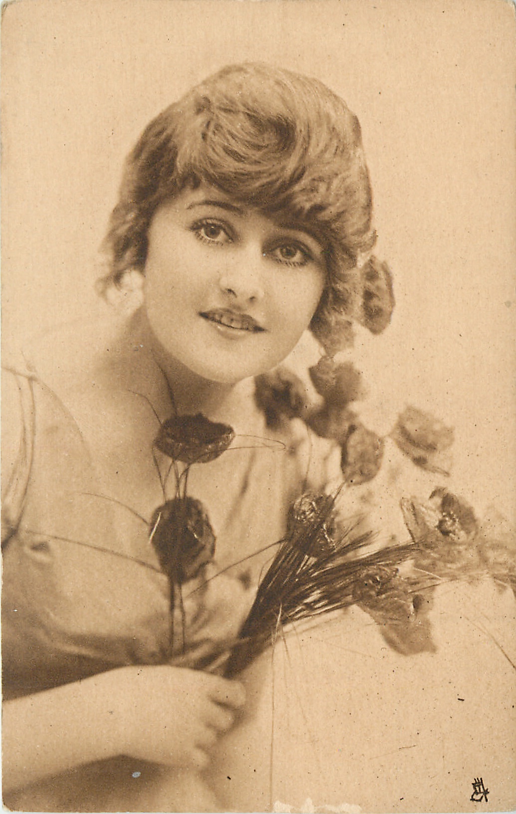 girl faces slightly right & looks front, artificial flowers right & held with right hand, fingers visible
