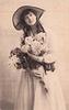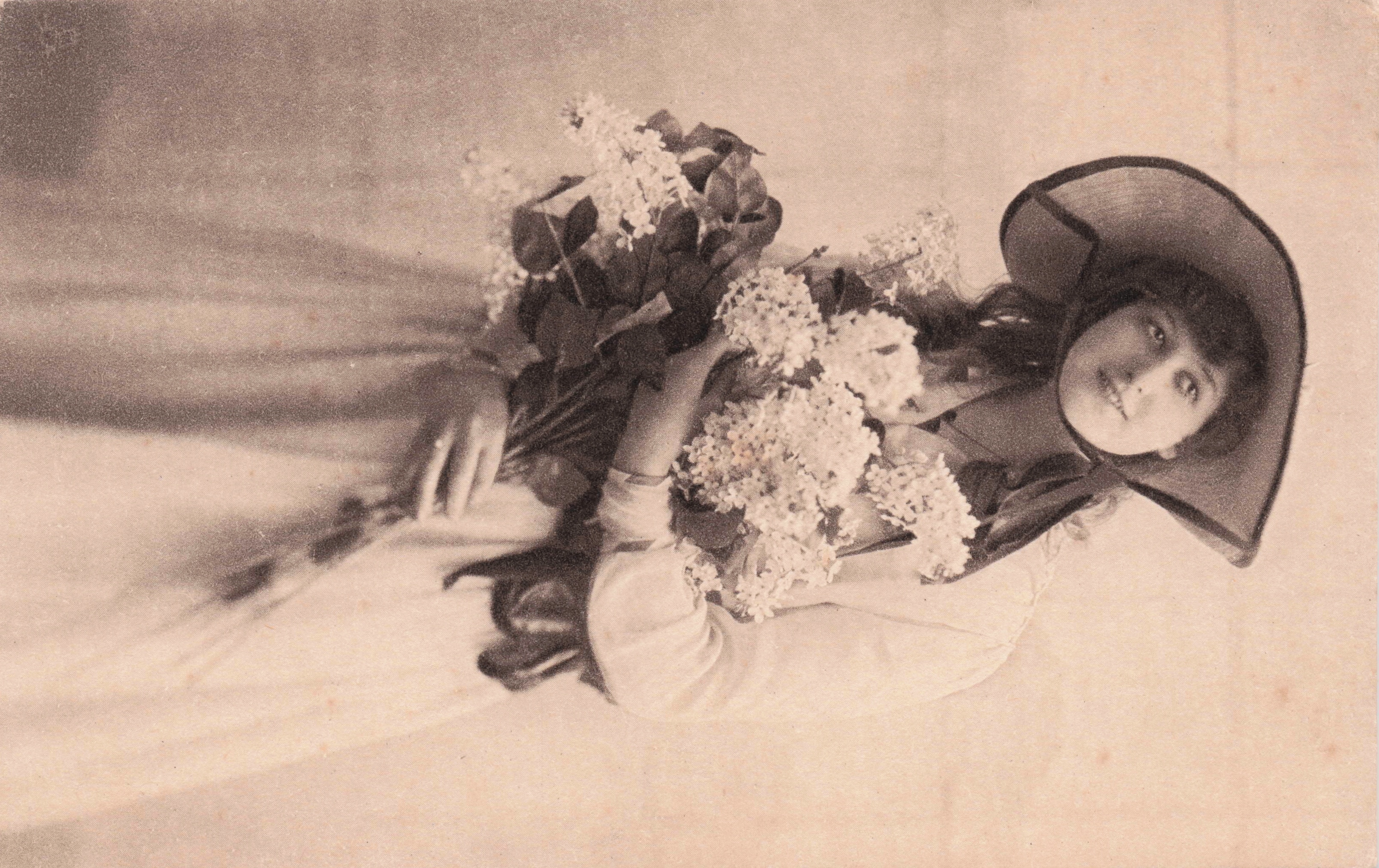 woman stands facing slightly left, holding bouquet of lilac close to her body, head tilted to her right, looking front & up