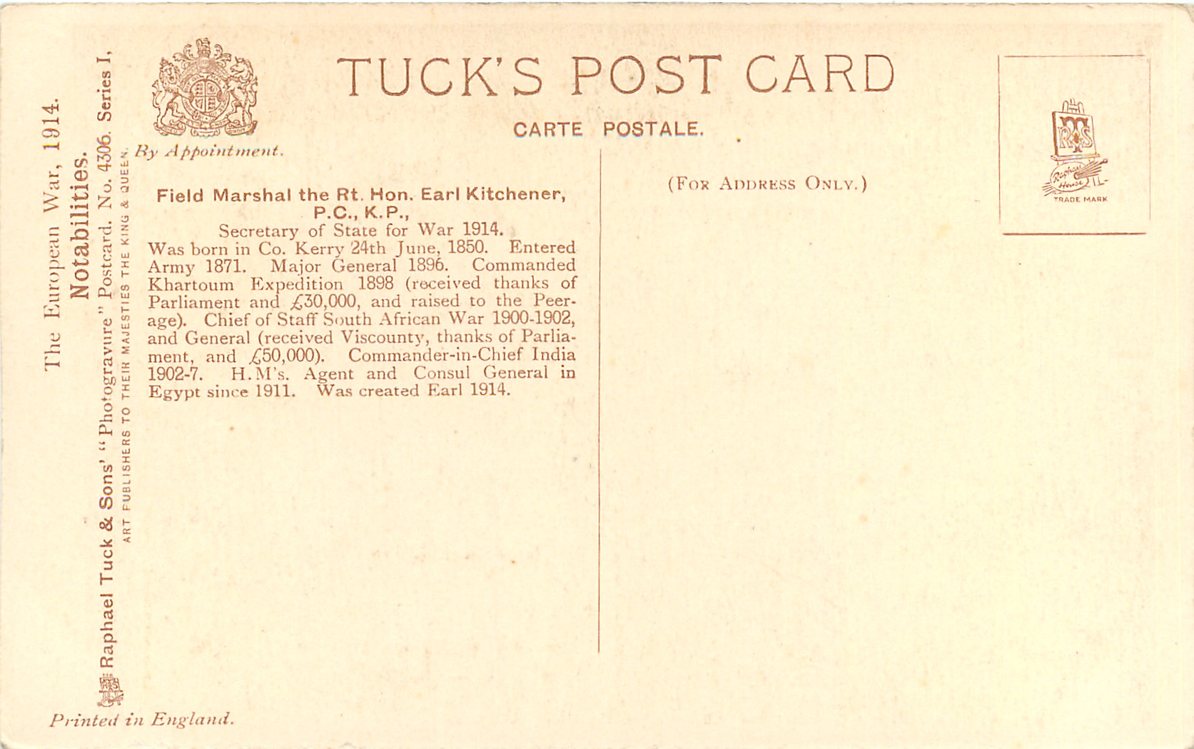 FIELD MARSHAL THE RT. HON. EARL KITCHENER, P.C.K.P. SECRETARY OF STATE FOR WAR, 1914