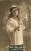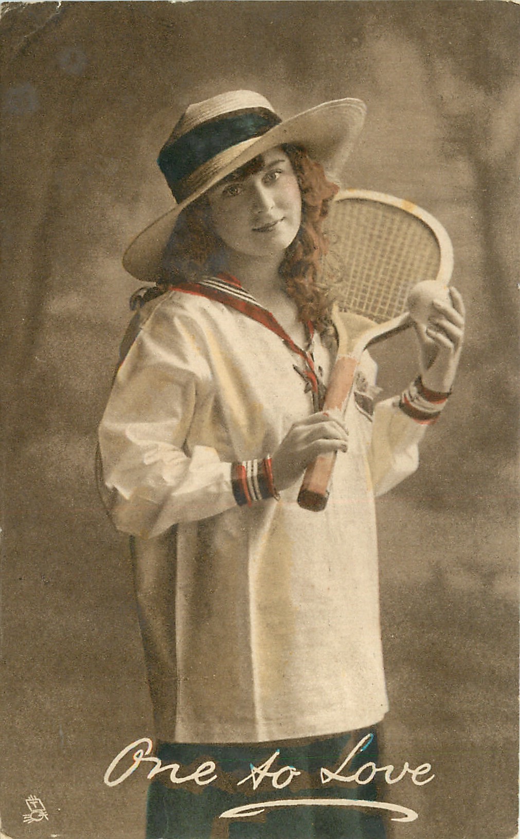 woman in tennis attire with racquet and ball, racket over her left shoulder