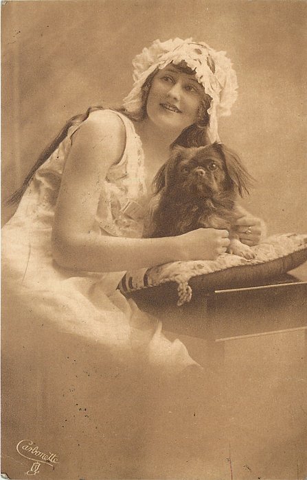 girl with frilly cap left of pekingese dog on pillow which faces front, girl looks up to left