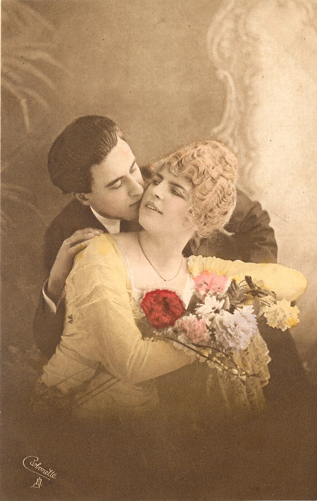 two lovers, he stands behind leaning forward to kiss her right cheek, she looks back at him