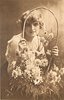 pretty girl holds hoop of basket of flowers with both hands, faces slightly right, looks front