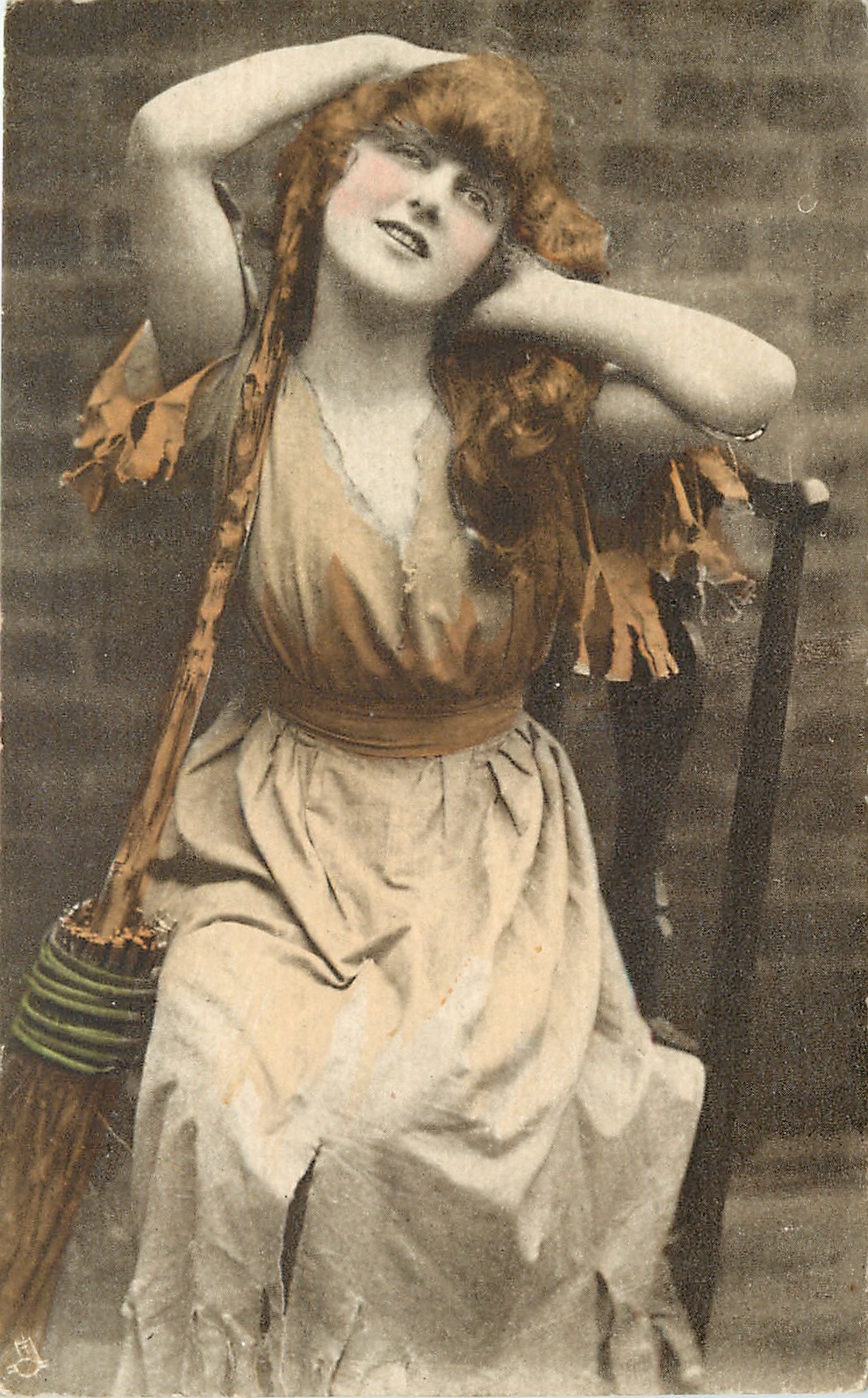 pretty woman sits on chair, broom leaning against right shoulder, both hands to head