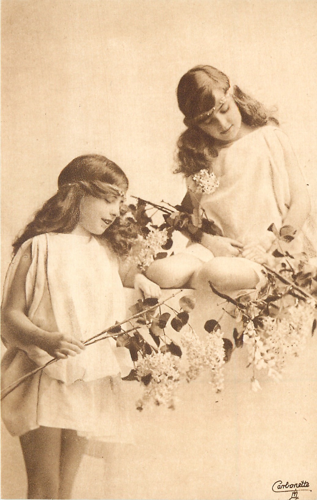 two girls in smocks, one sitting on wall with flowers, other standing with flowers