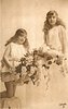 two girls in smocks, one sitting on wall, other kneeling to left with flowers