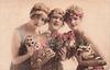 three pretty girls carry flowers, centre girl faces front & looks up, girl to right faces & looks front,her left elbow prominent, four hands visible