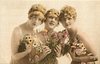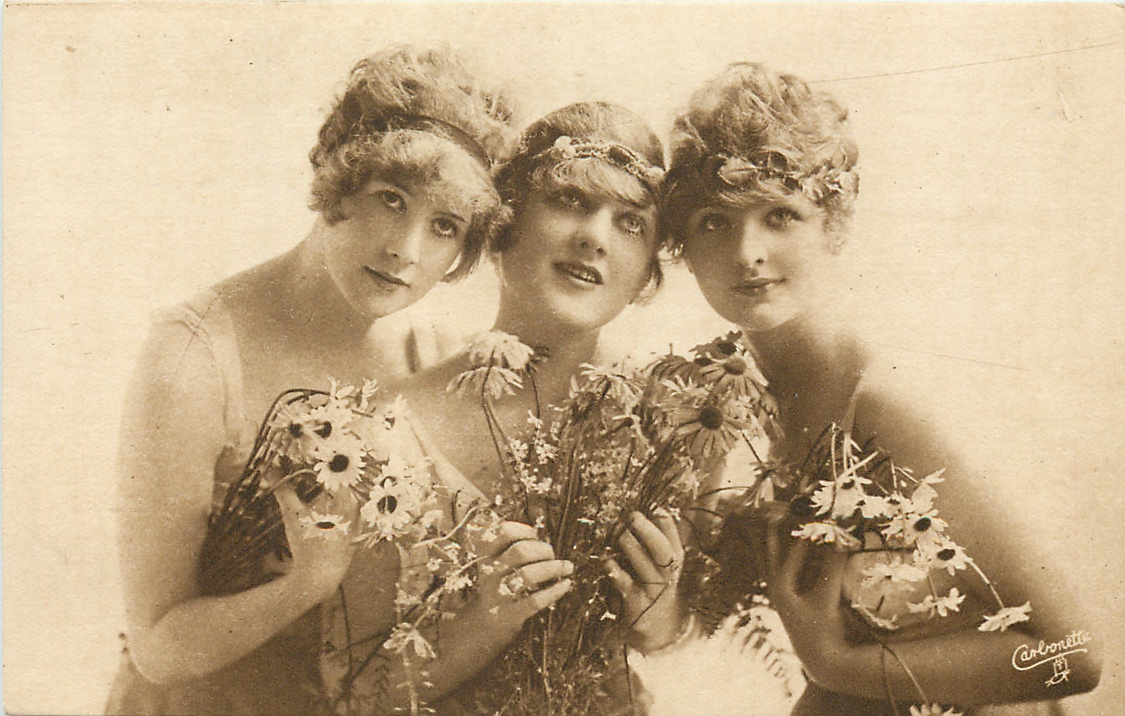 three pretty girls carry flowers, centre girl faces front & looks up, girl to right faces & looks front, her left elbow prominent, four hands visible