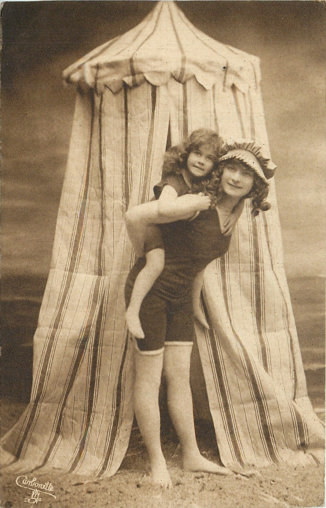 mother & child in front of striped canvas bathing tent, mother giving child a piggy-back