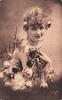girl posed in very off shoulder dress, faces right looks forward, holds flowers in the crook of her right elbow & under her right arm