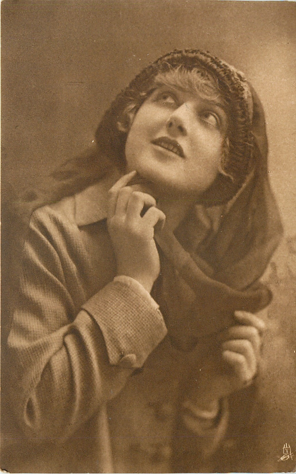 girl in coat & hat prepares for stormy weather, left hand holds flimsy scarf at neck, left hand near face, faces & looks left