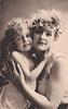 young lady with little girl, lady with short hair and band around head, little girl to left, cheek beside cheek, both looking forward