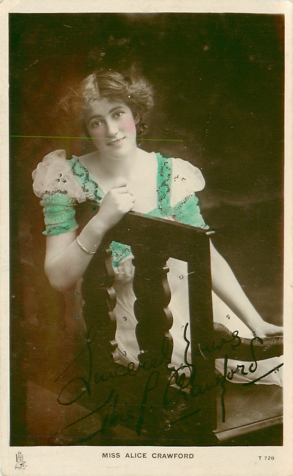 MISS ALICE CRAWFORD sitting with arm over back of seat, facing & looking front