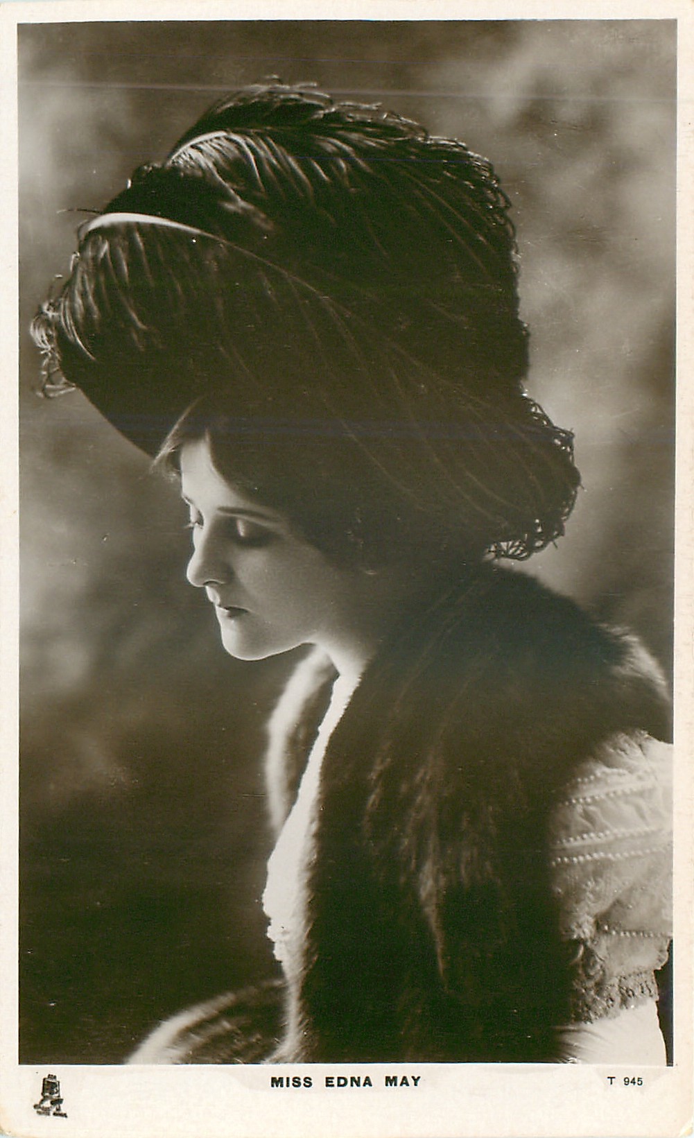 MISS EDNA MAY head & shoulders, large hat, facing left, looking down