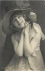 model posed standing in front of tree trunk, hands clasped & touching her left cheek, looks up to her left