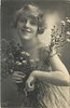 girl with short hair, off shoulder dress, many flowers in right arm but only single stem in left, smiling, looking front
