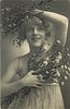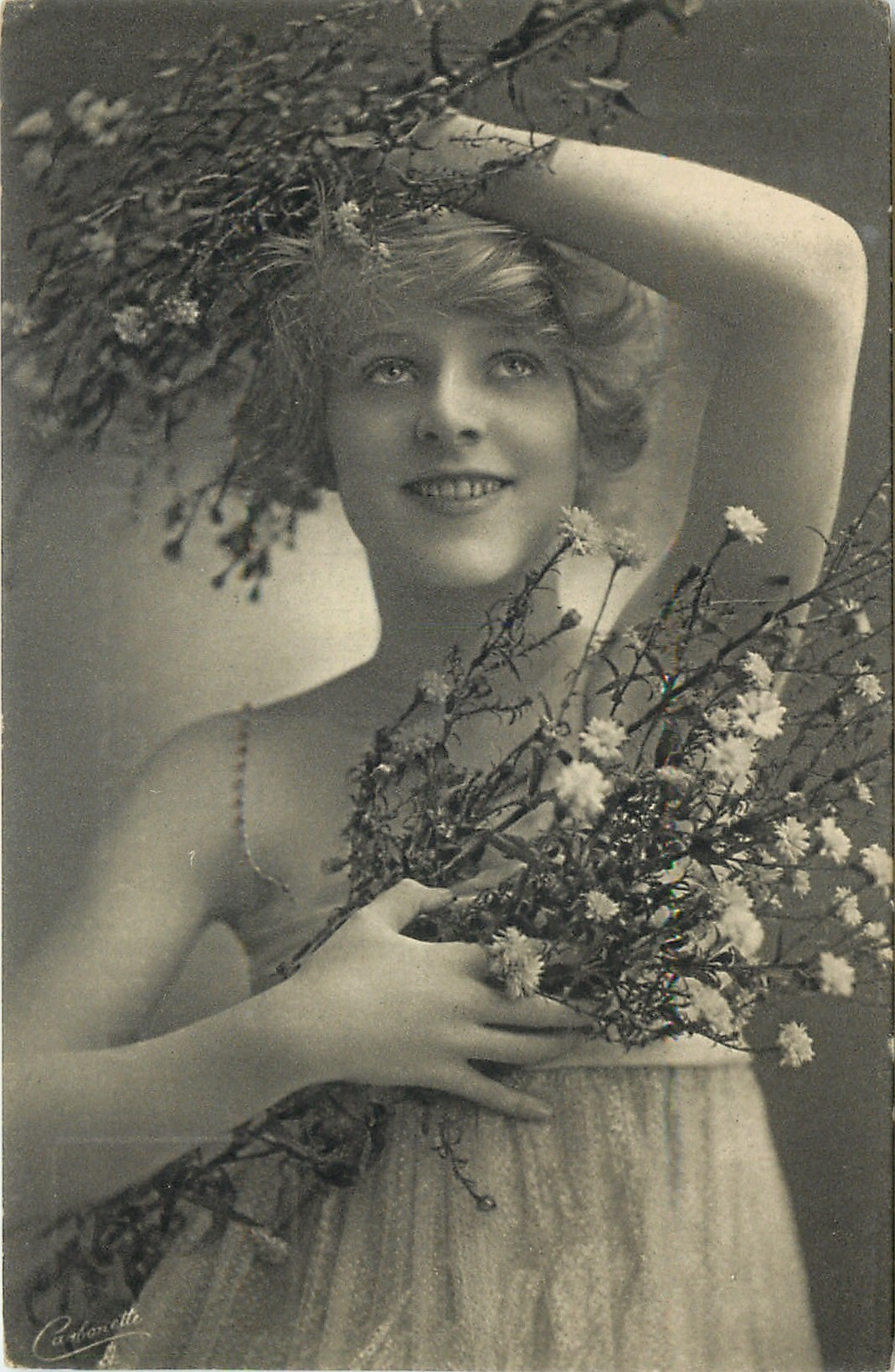 girl with short hair, off shoulder dress, many flowers in both arms, smiling, left hand over her head, looking up