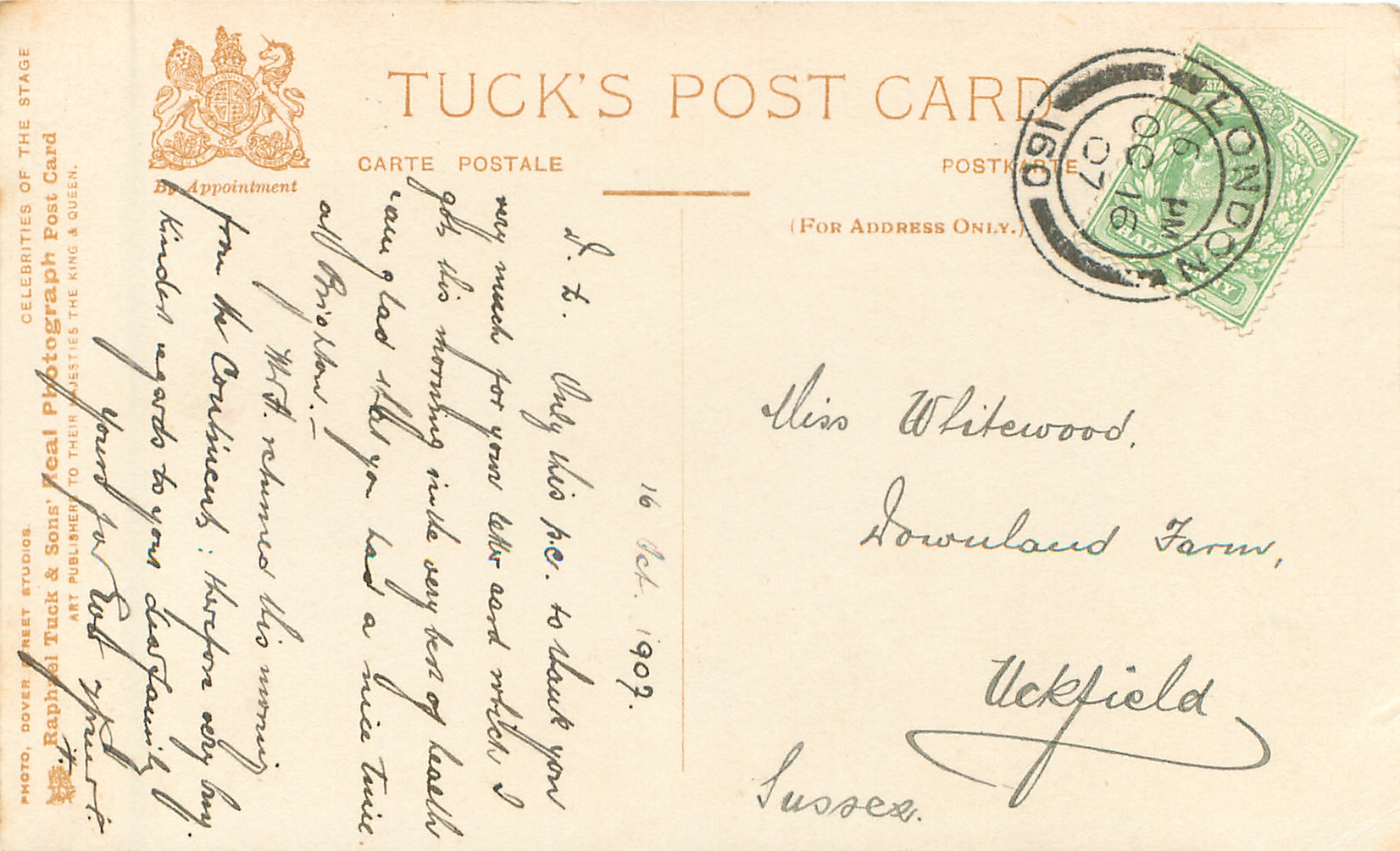 with facsimile autograph, comes hand-coloured Miss Alexander Carlisle (1886-1936 NYC) was in "The Mollusc" Criterion Th. 1907 (324)