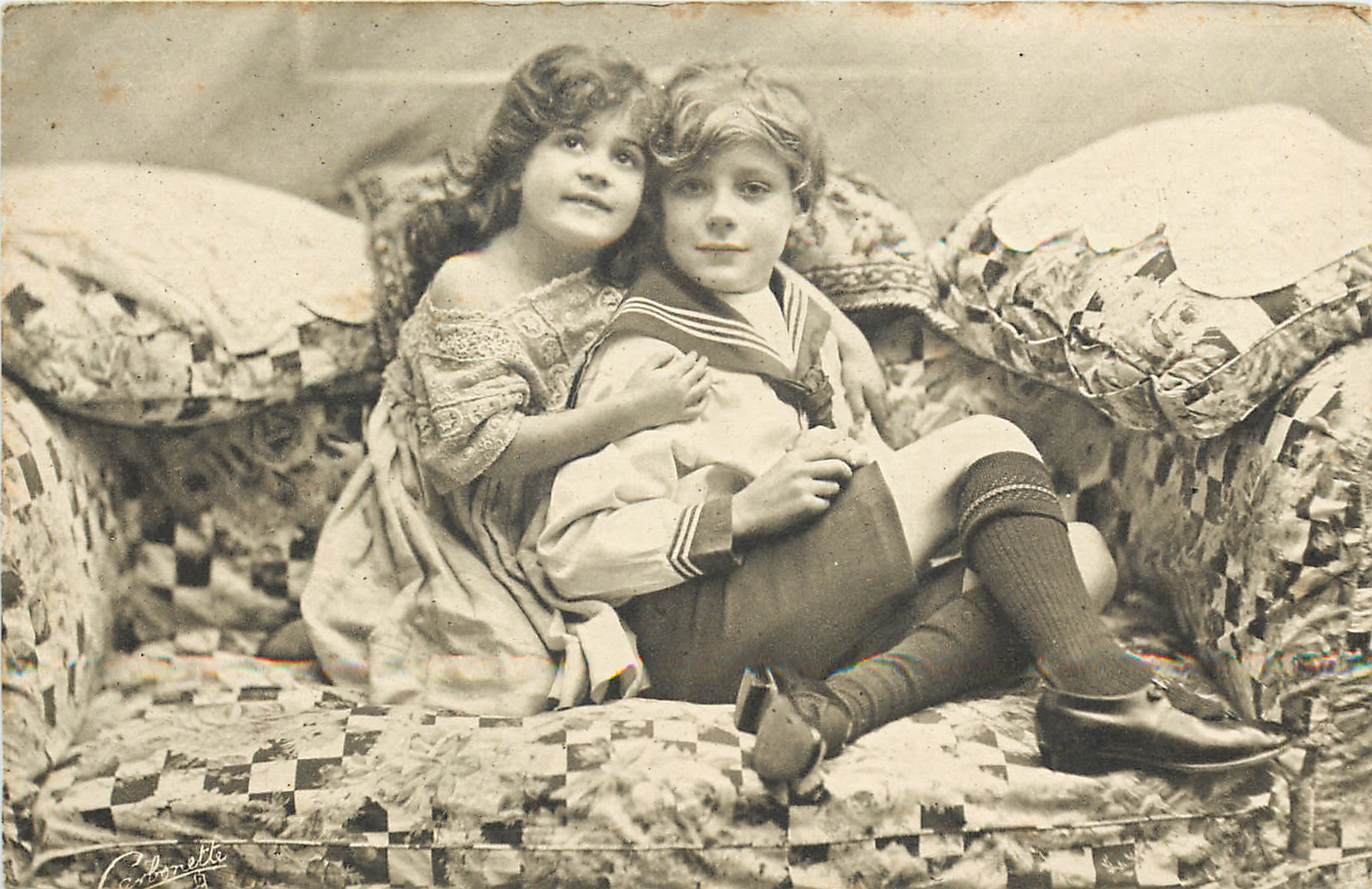 boy & girl on couch, girl to left with her arms around boy, his right hand on his thigh, shoes prominent