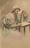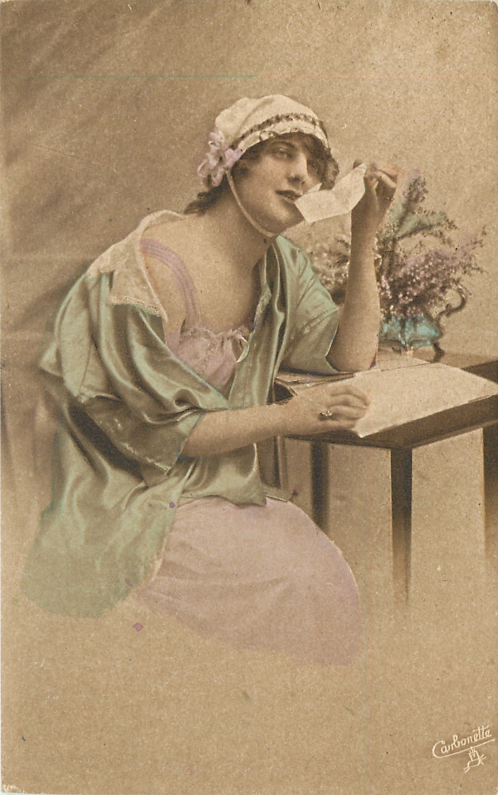 girl in floppy robe & bonnet sits to left of table, right hand on blotter, left holds letter to her lips