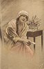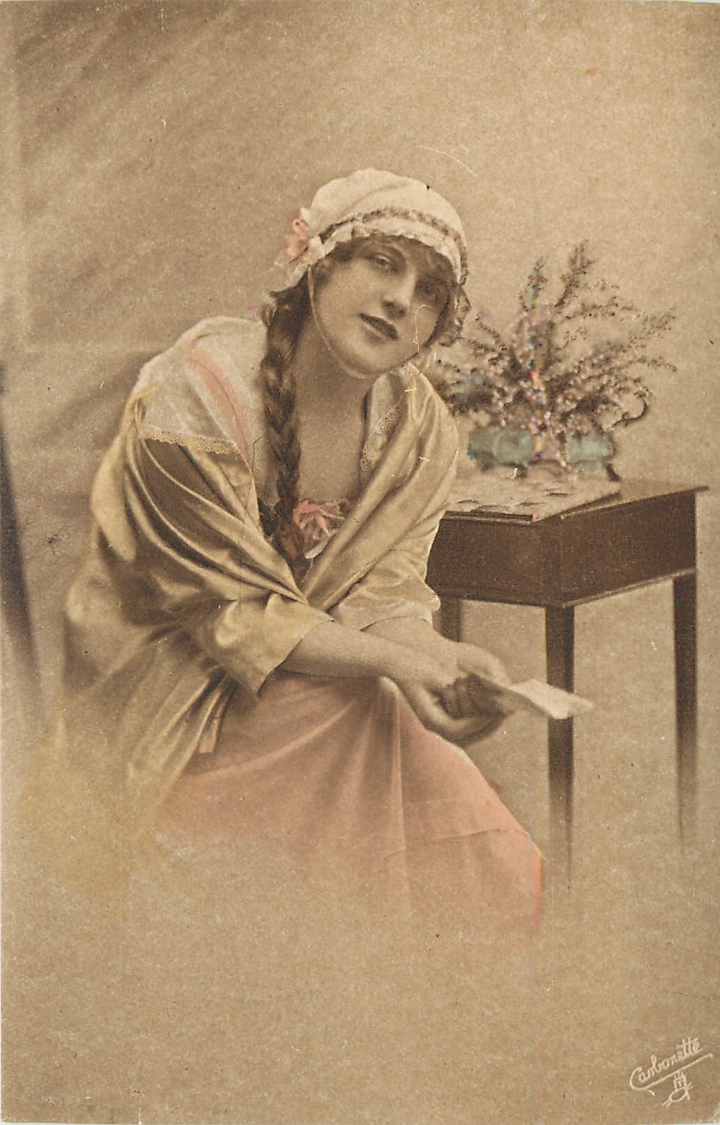 girl in floppy robe & bonnet sits to left of table, holds letter with both hands