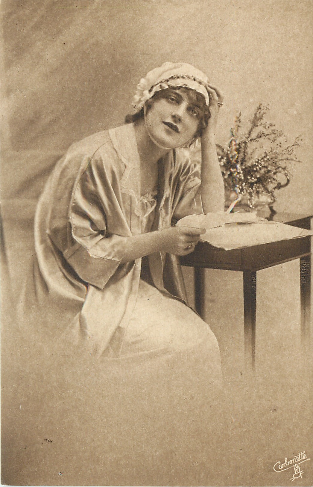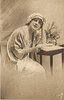 girl in floppy robe & bonnet sits to left of table, holds letter with right hand , rests head on left hand