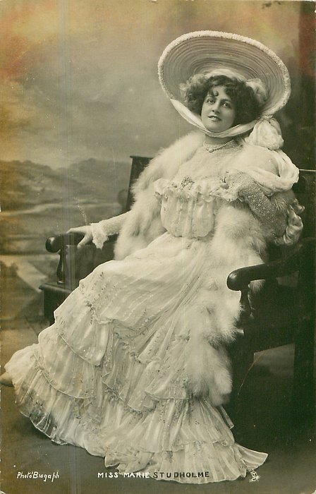 PHOTO BIOGRAPH, seated in chair, wears enormous hat, faces slightly left, looks front & up, same image P337