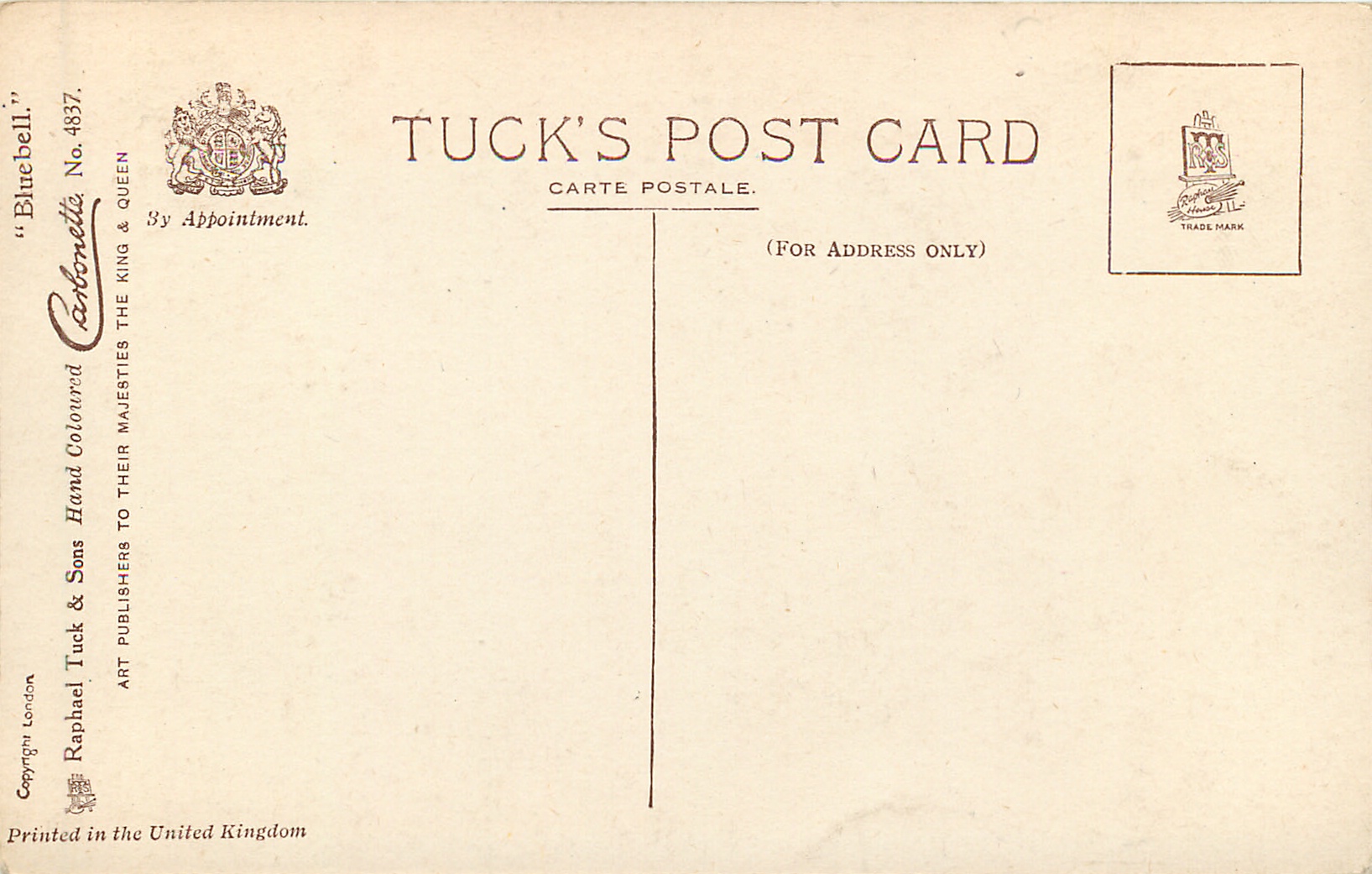 HAND COLOURED CARBONETTE (on sepia) PRINTED IN THE UNITED KINGDOM, COPYRIGHT LONDON, same images CARBONETTE 4887