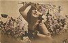 girl poses facing left, looking up, holding flowers over her head, flowers also on both sides