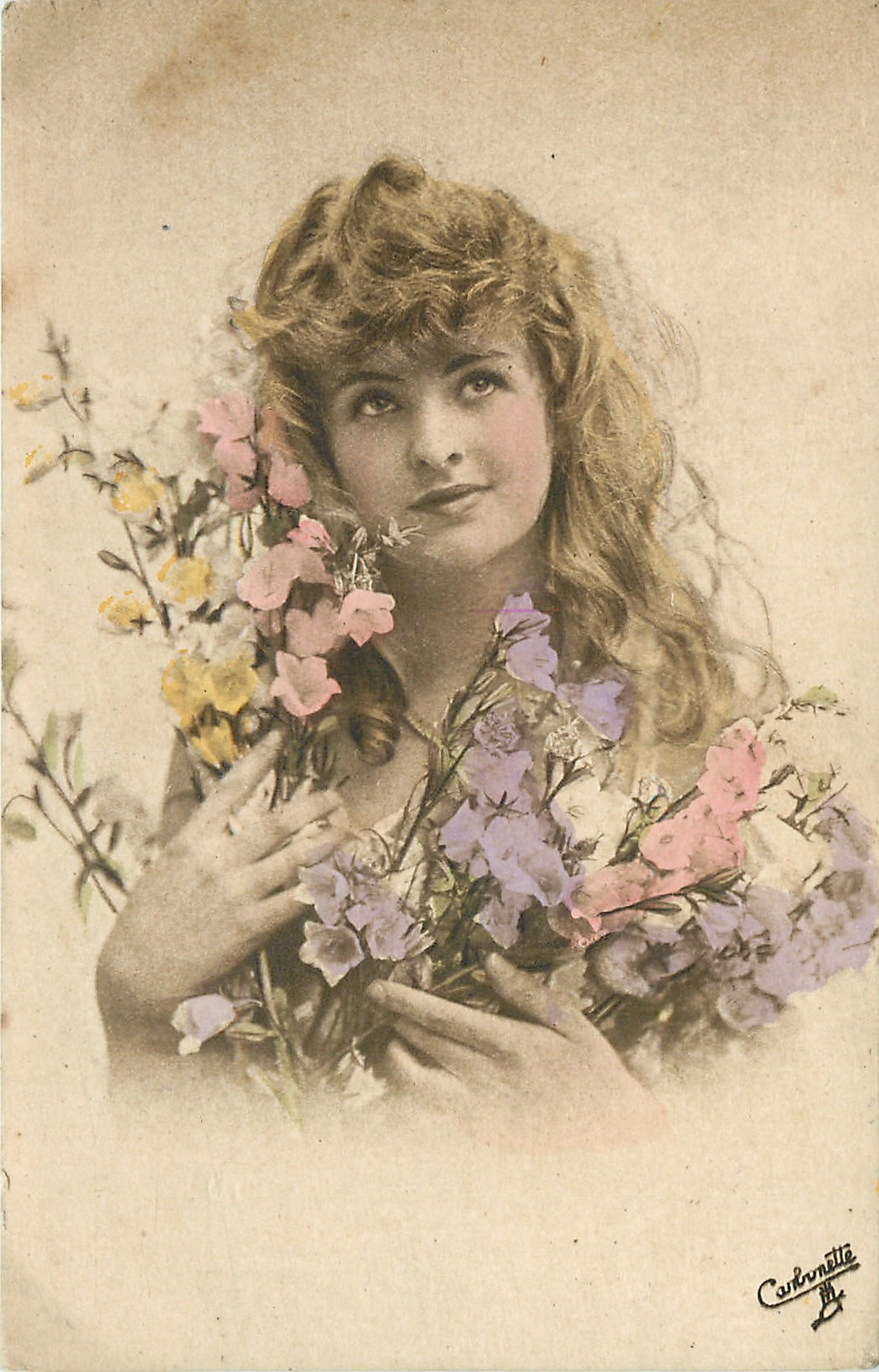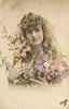 woman looks up, long hair, both arms curl around flowers, right thumb not visible